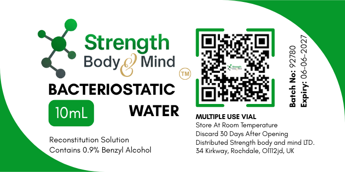 Bacteriostatic Water for Reconstitution, 10ml, This sterile, pyrogen-free solution contains 0.9% Benzyl Alcohol as a bacteriostatic preservative. It is specifically formulated for laboratory research and compounding applications. **Note: This product is for research use only and is not intended for human consumption, injection, or veterinary use.** Store at 20-25°C and protect from light to ensure quality.